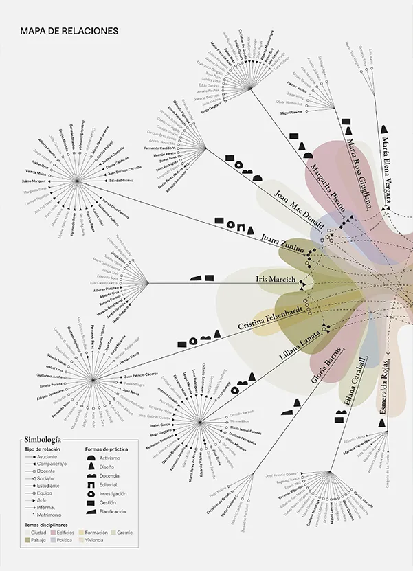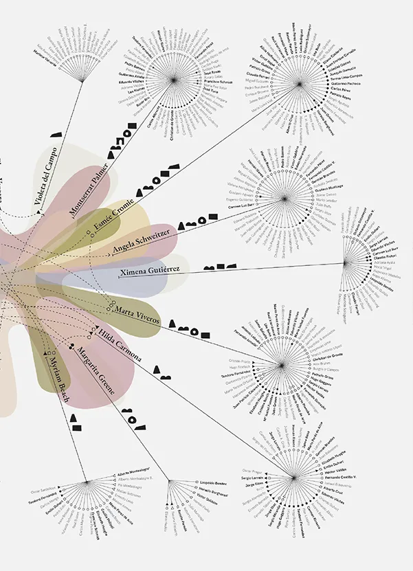Para este proyecto desarrollé dos sistemas de visualización que contextualizan y estructuran la investigación: una línea de tiempo que sitúa el trabajo de las arquitectas dentro de marcos históricos y políticos, y un mapa relacional que articula vínculos entre ellas y otros actores relevantes del campo. Estas piezas funcionaron como herramientas de análisis y comunicación en dos instancias: la exposición en Barco Galería para la Arquitectura (Santiago, Chile) y la publicación editada por Ediciones UC, que recopila y amplía los hallazgos del proyecto.