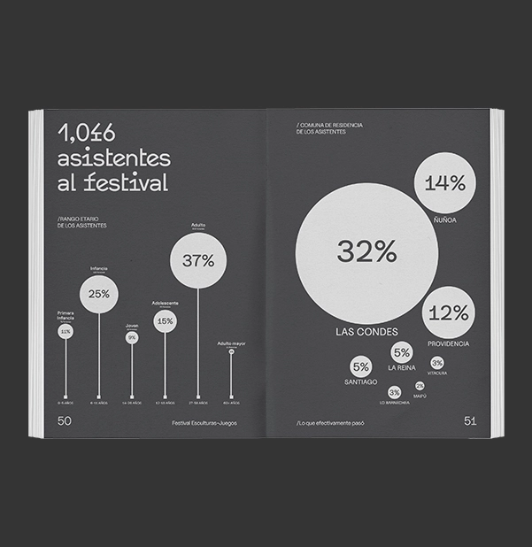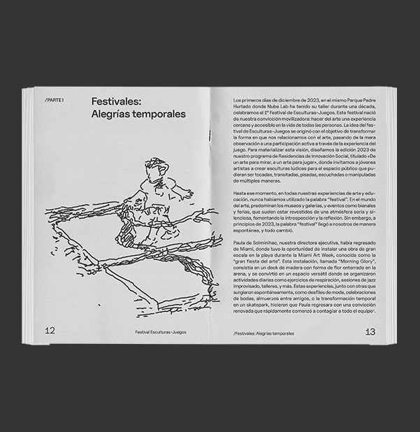 En 2023 y 2024, desde Ediciones Nube Lab y a partir de la investigación de Consuelo Pedraza, desarrollé el diseño editorial de dos informes que sistematizan el impacto del festival. Estos documentos traducen aprendizajes y evidencias en narrativas visuales sobre cómo el arte contribuye a la regeneración de espacios públicos, fortalece vínculos sociales y promueve el bienestar colectivo a través del ocio compartido.