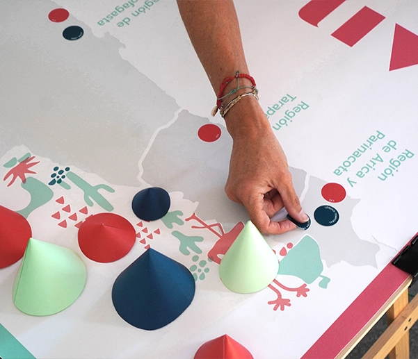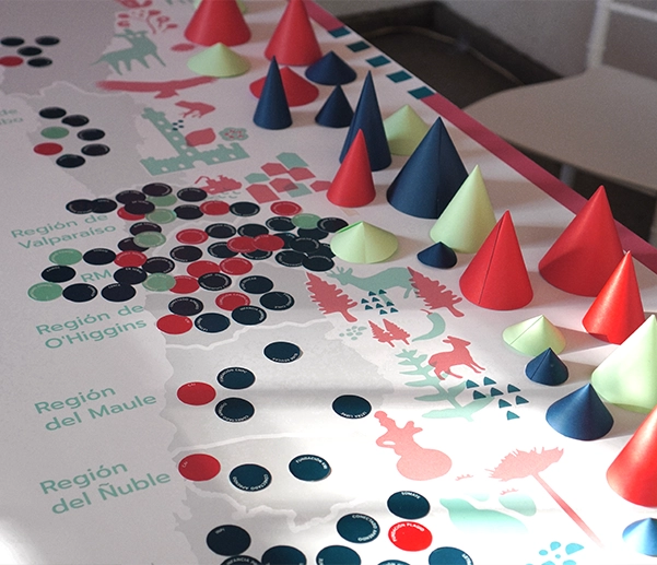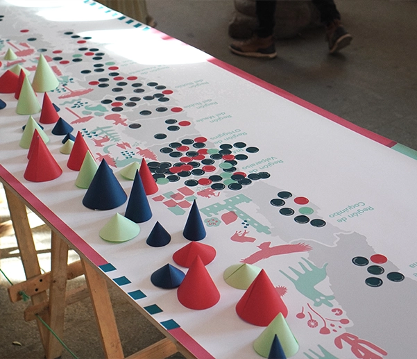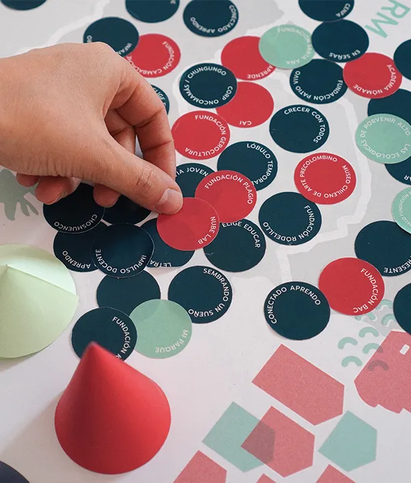 Colaboré en el desarrollo de un mapa interactivo y participativo como dispositivo de activación: al llegar al evento, cada representante recibió un sticker con el nombre de su organización y lo situó en el mapa, marcando la ubicación de sus beneficiarios. Esta dinámica transformó la visualización de datos en una acción colectiva de co-creación, facilitando el reconocimiento entre pares y materializando la red en un gesto compartido. Desde Nube desarrollamos la experiencia integral: diseño de interacción, procesamiento y visualización de datos, producción física e ilustración.
